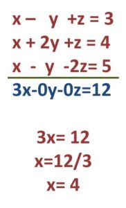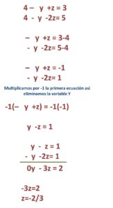 conociendo el valor de X lo sustituimos en la ecuación uno y tres, para trabajar con un sistema de ecuaciones 2×2, de esta forma eliminar una de las variables;